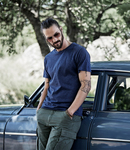 50% ringspun cotton/50% polyester. Enzyme washed. Fashion fit. Narrow ribbed collar with elastane. Taped neck and shoulders. Side seams. Twin needle sleeves and hem.