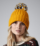 100% soft spun acrylic. Polyester shearling lining. Heavyweight ribbed knit design. Oversized luxury pom pom. Cuffed design. Tear out label.