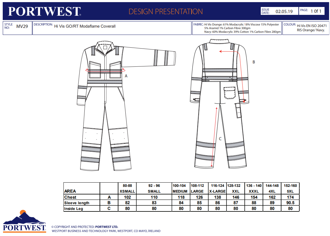 Datasheet - https://documents.portwest.com/datasheet.php?style=MV29&lang=GB&itemcol=MV29ONR&facility=902